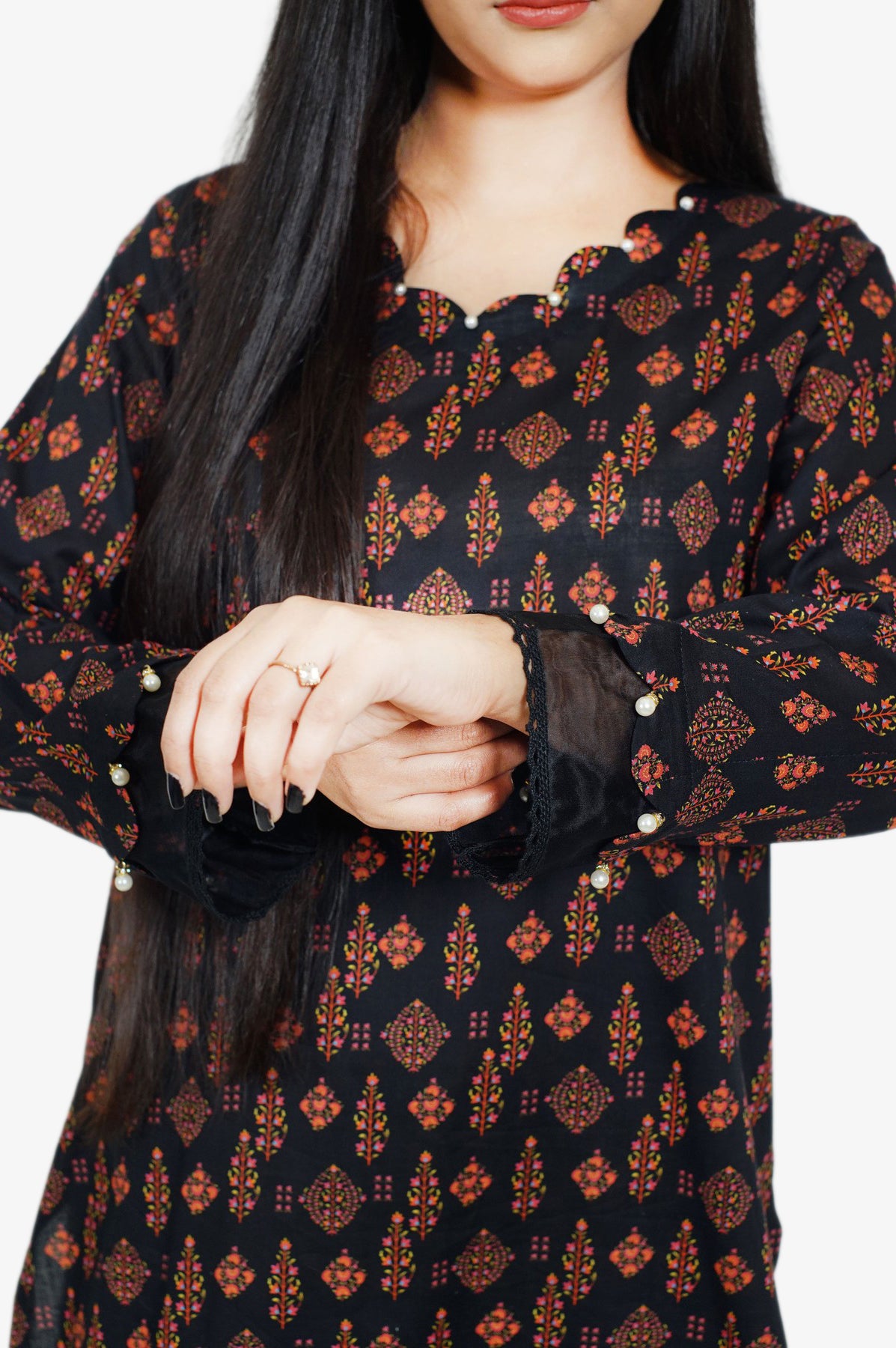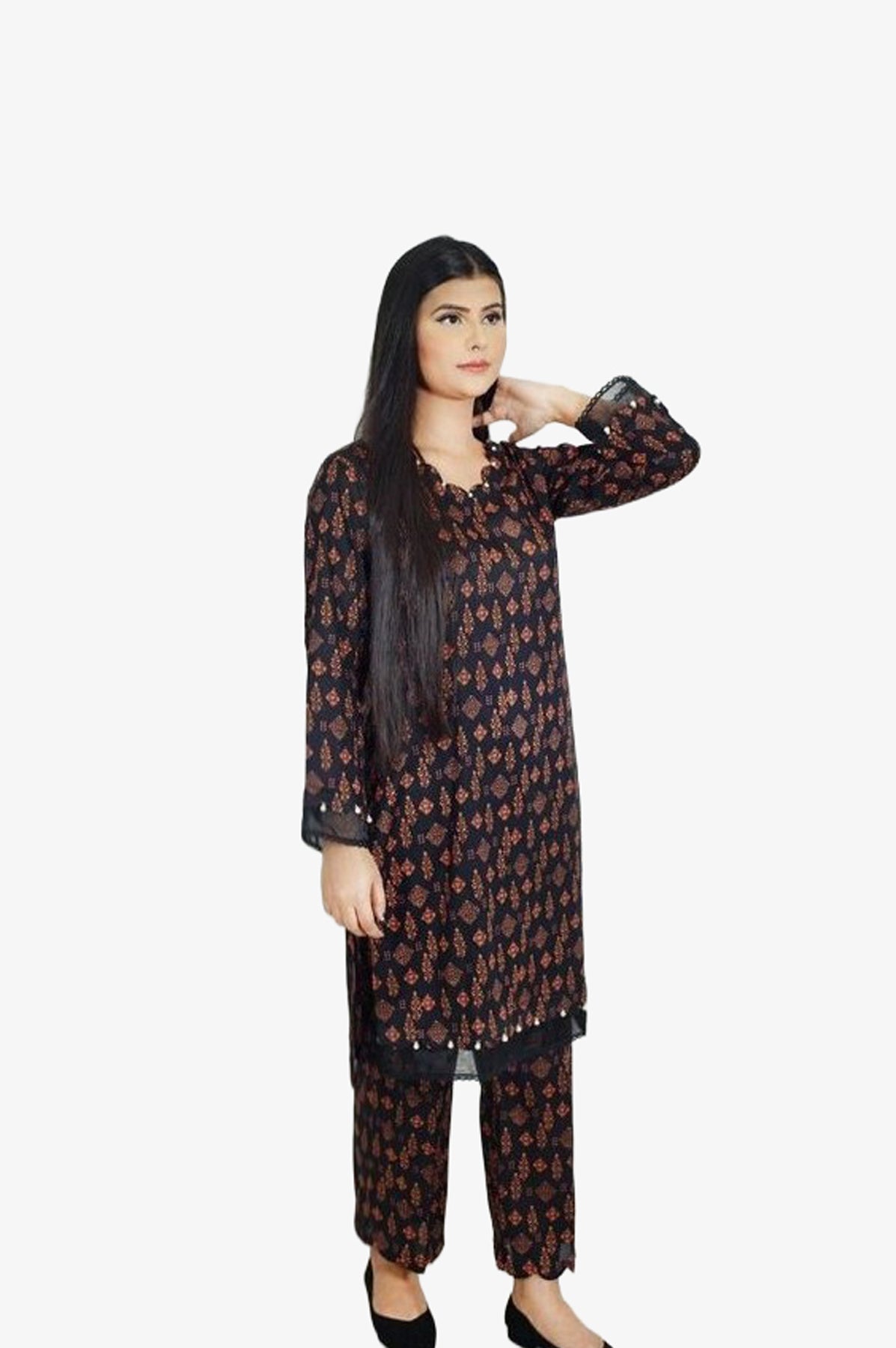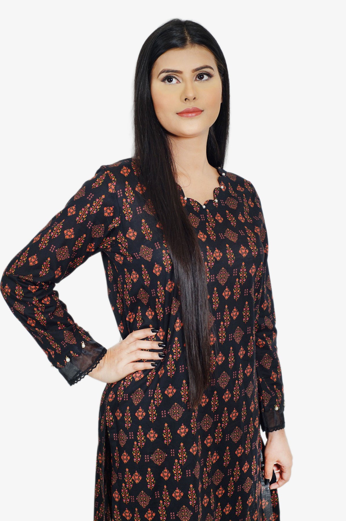 A elegant design is portrayed on this classy ensemble illustrating a blooming canvas. It features a contemporary silhouette shirt adorned with floral prints in pink and orange tones. Enhanced with trendy buttons at front, on sleeves with organza patch. This aesthetic shirt is paired with matching trouser making it a great option for fun gatherings.