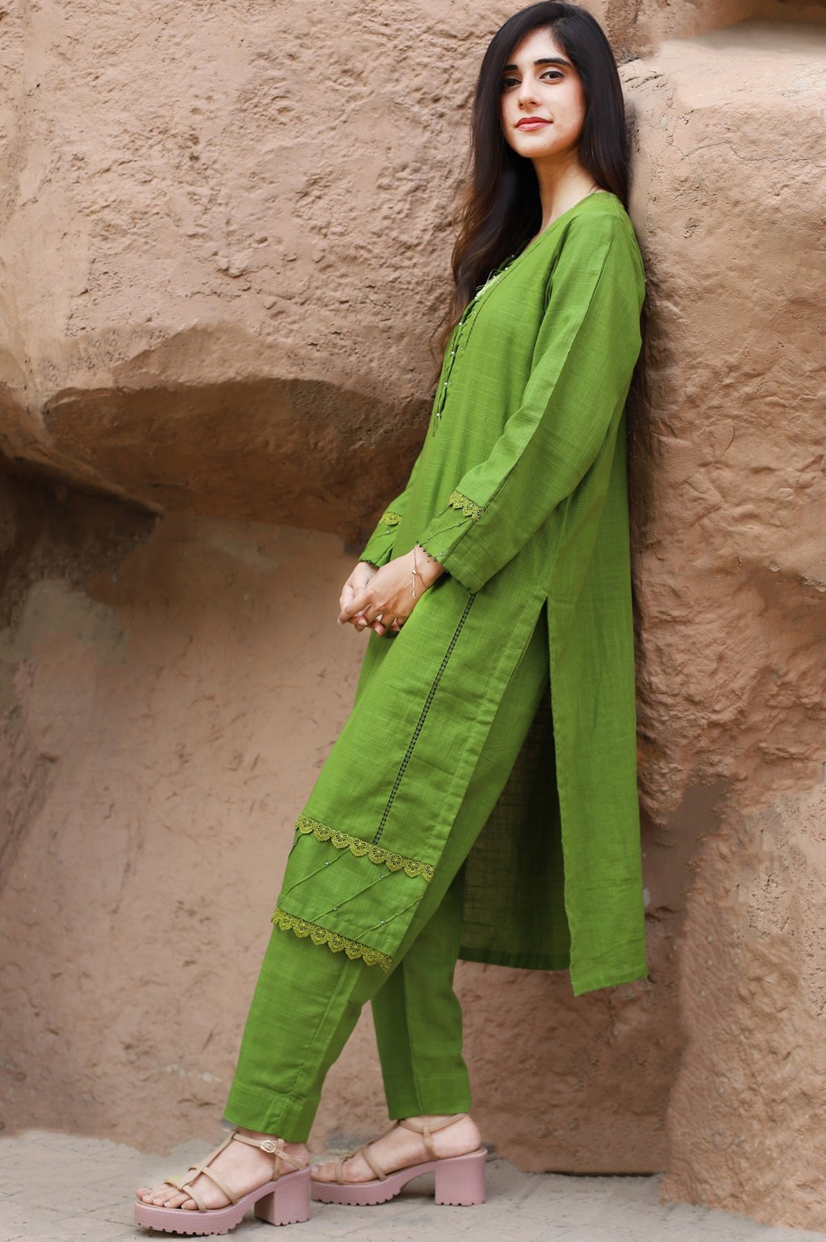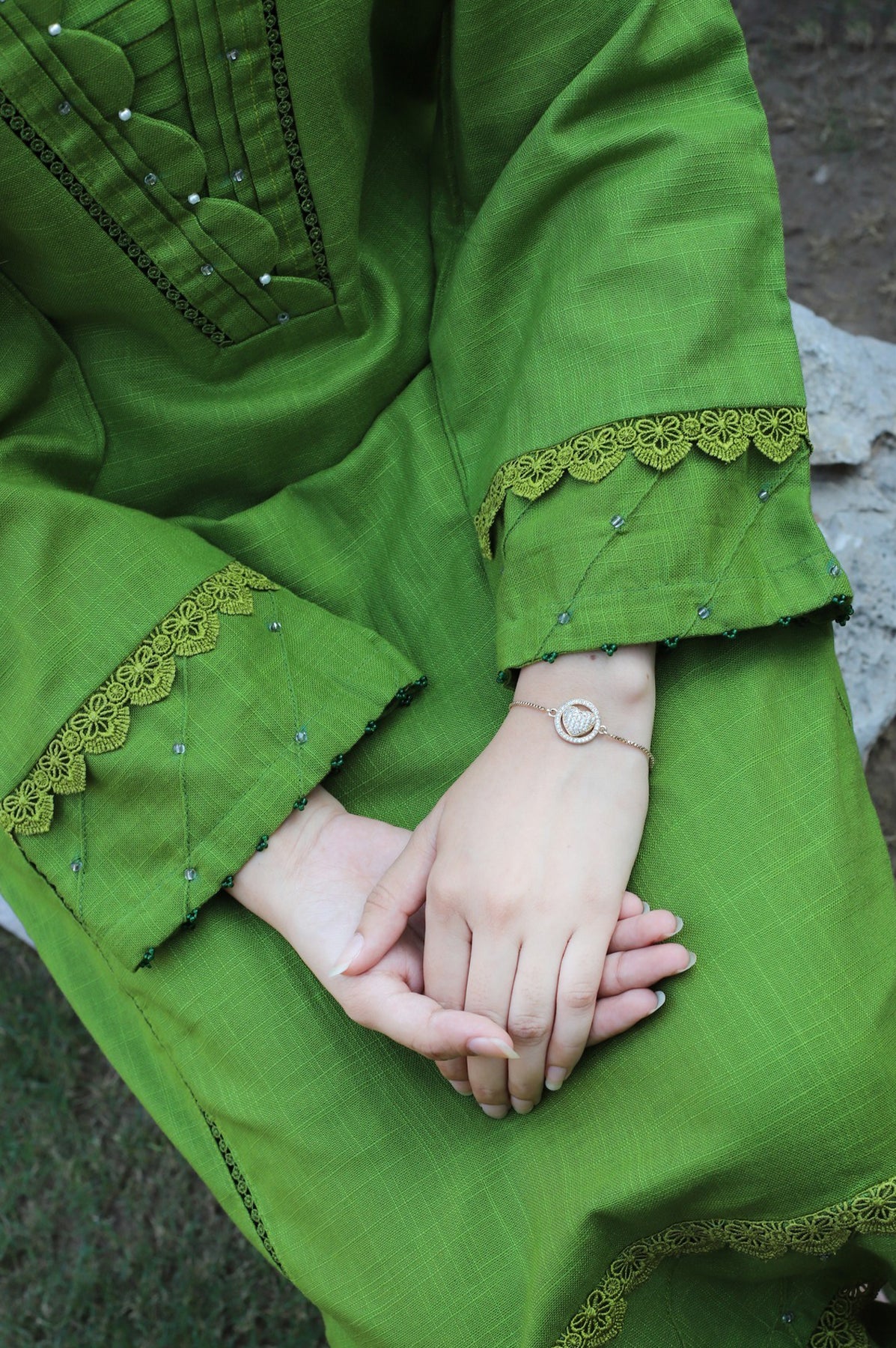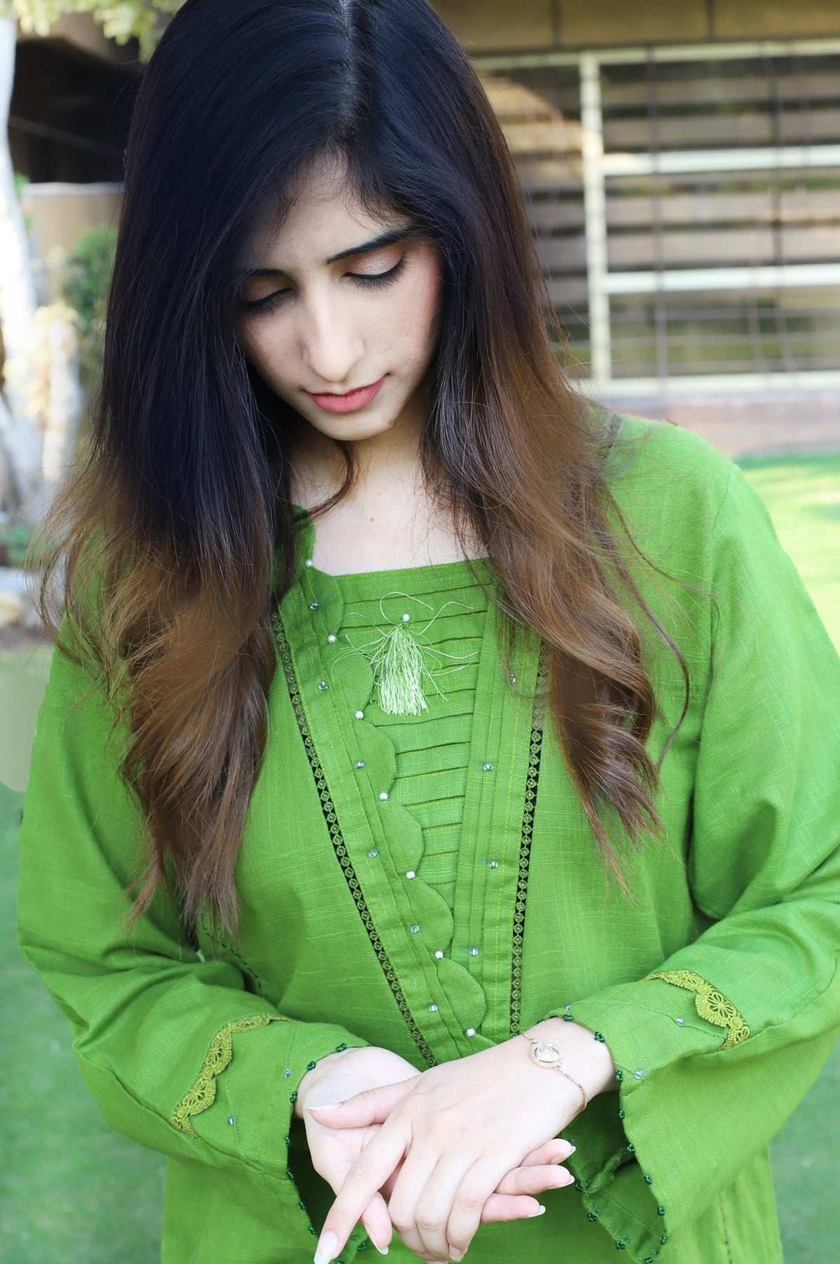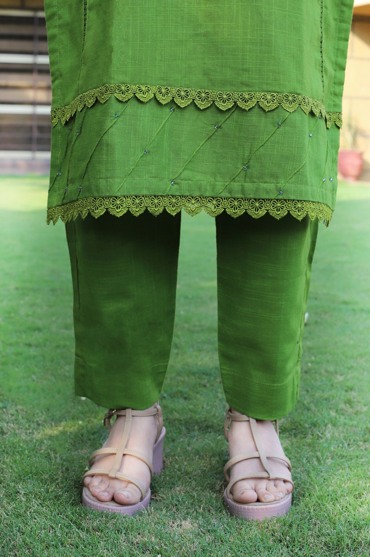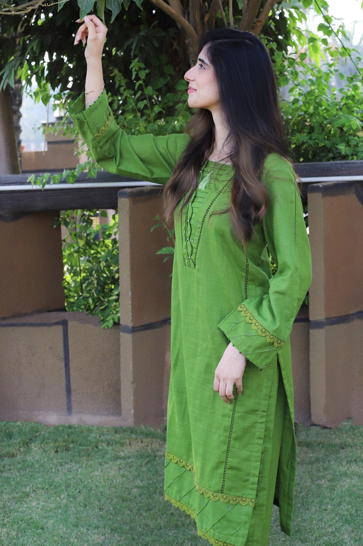 Elegant 2-piece green dress featuring a shirt with lace-attached panels and a pleated neckline with pearl embellishments. The sleeves and daman are detailed with pleats, lace, and pearls for a refined touch. Paired with a matching plain trouser, this set offers a chic and sophisticated look.