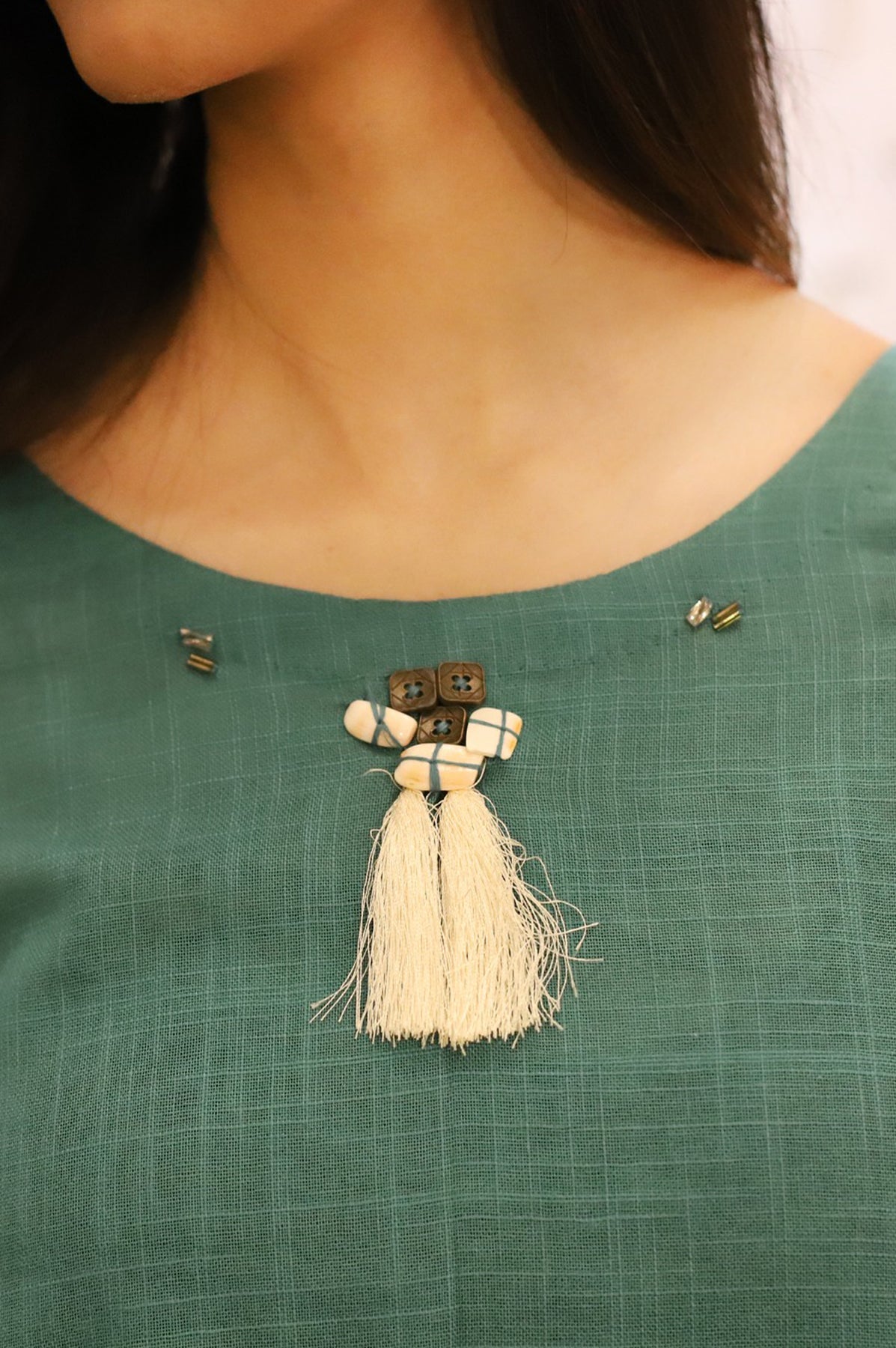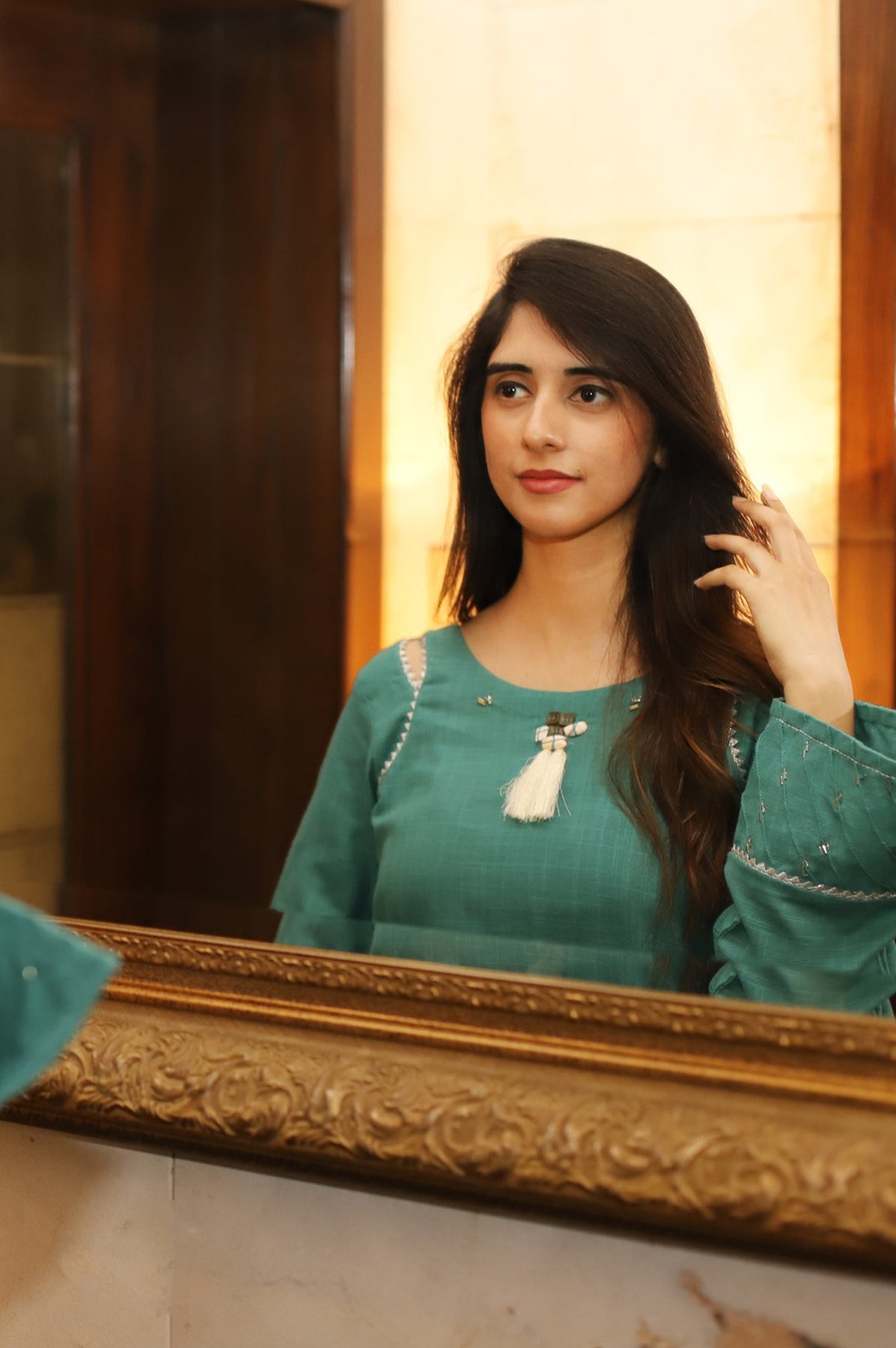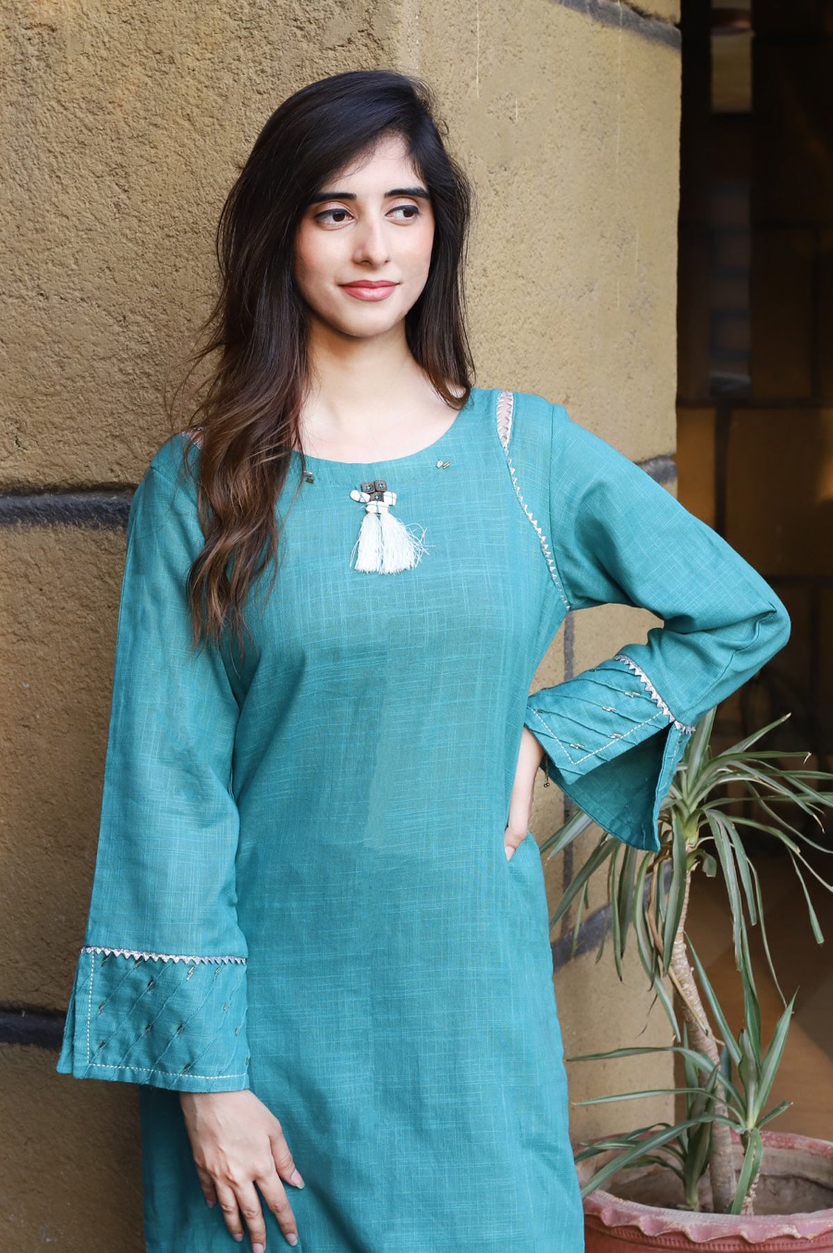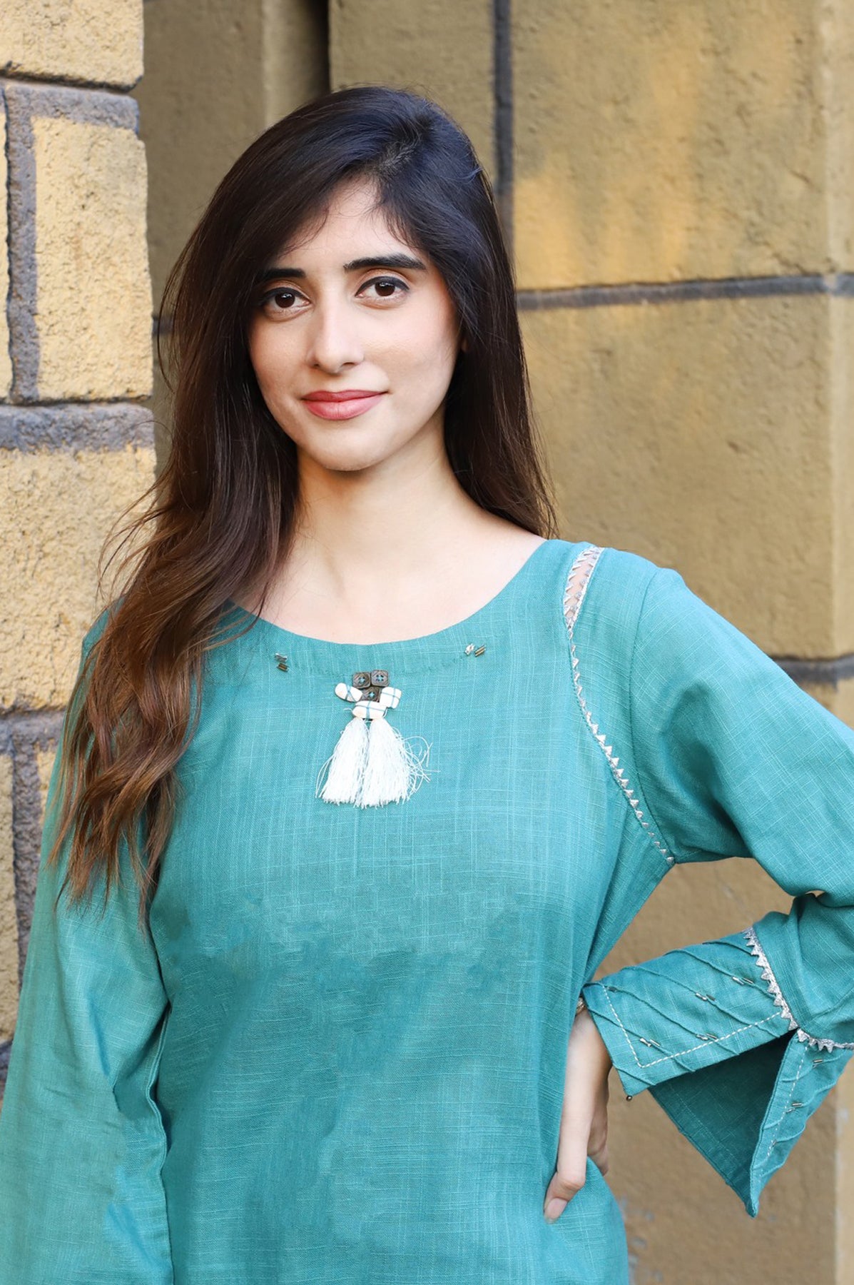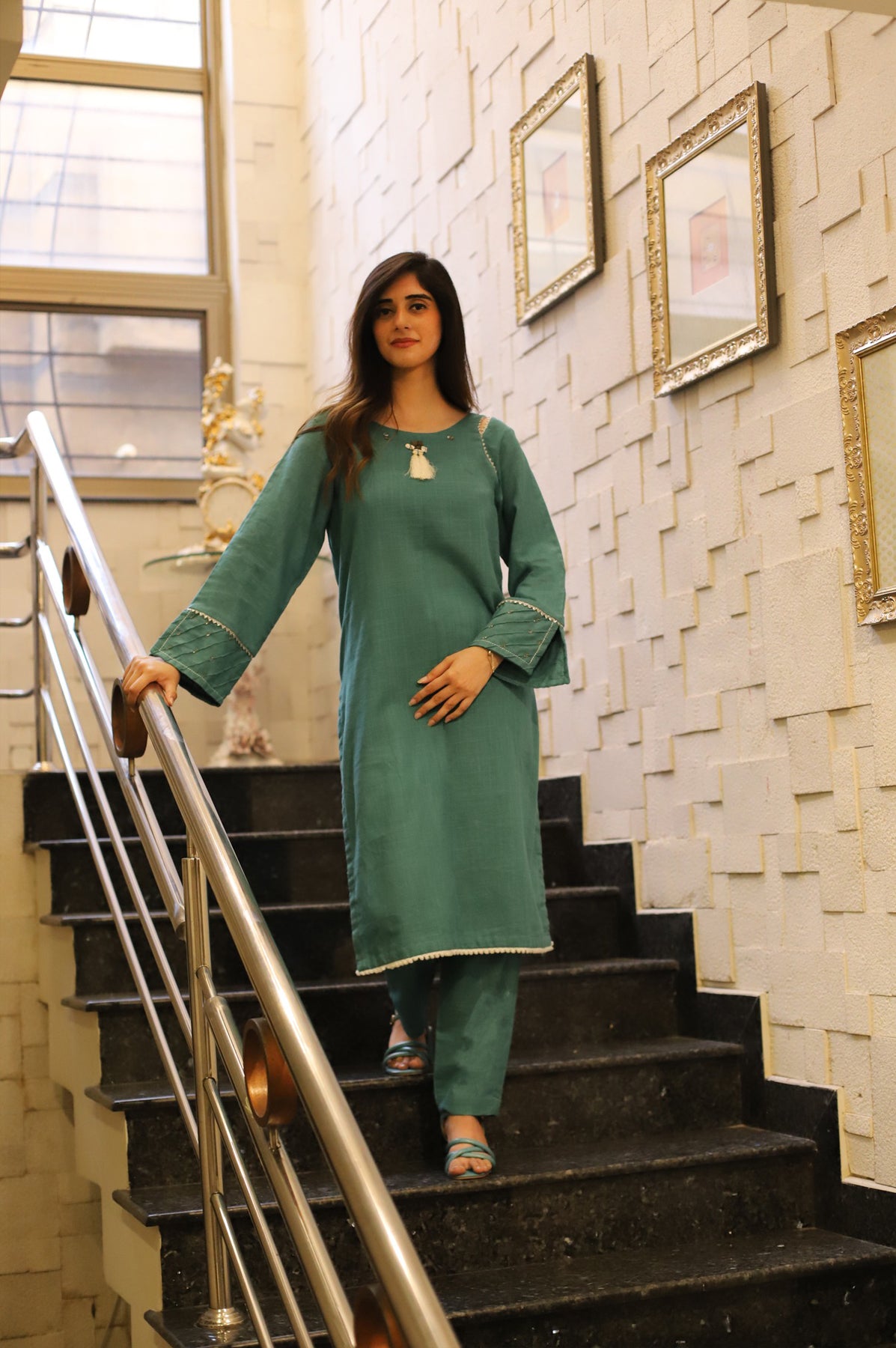 Elegant ferozi 2-piece set with a round neckline and button embellishments. The shirt features a cut design on the shoulders with lace, while the pleated sleeves are adorned with white and golden bugle glass beads. Finished with lace on the daman and matching plain trousers.